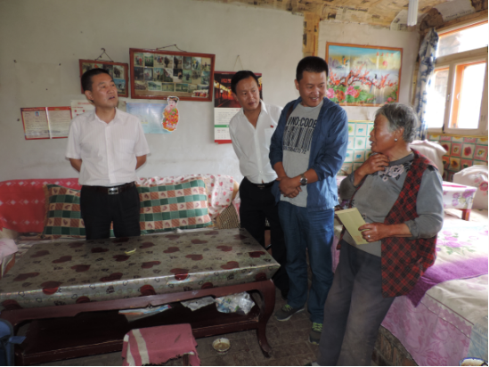 朝物開(kāi)投公司副總經(jīng)理喇軍民、物產(chǎn)汽貿(mào)公司董事長(zhǎng)張建軍、機(jī)電市場(chǎng)公司市場(chǎng)部部長(zhǎng)王功明以"三幫一"的方式結(jié)對(duì)幫扶絕對(duì)困難戶(hù)楊生福。楊生福,男,藏族,61歲,家中三口人,本人肢體四級(jí)殘疾,妻子四級(jí)殘疾(羅鍋),兒子30歲,現(xiàn)安排在當(dāng)?shù)貜氖伦o(hù)林員工作,未結(jié)婚,住房為土木結(jié)構(gòu),此次結(jié)對(duì)幫扶為其送去了600元慰問(wèn)金。