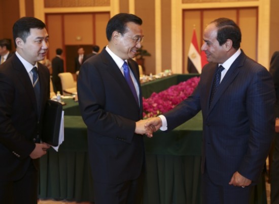 李克強總理會見埃及總統(tǒng)塞西,就對方希望"加強反恐合作"提議表示:"我們既要加強反恐合作,也要妥善解決熱點問題,更要高度重視發(fā)展經(jīng)濟,以鏟除恐怖主義傳播的土壤。"